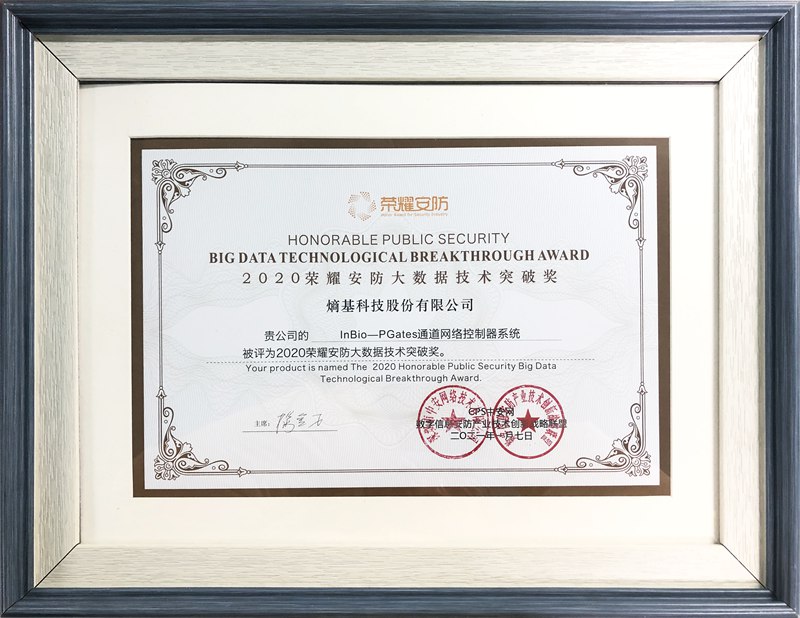 会议同期还举办了2020年“荣耀安防·大数据”颁奖典礼,疫情爆发以来,大数据的价值得到了充分的展现,未来,大数据的深层次挖掘和应用,也将成为企业的核心竞争力。凭借突出的产品技术优势,熵基科技InBio ——PGates通道网络控制系统获评“2020年度荣耀安防大数据技术突破奖”,该系统通过控制器将读卡器和输入设备、输出设备连接,组成一个完整的控制系统,可实现高安全级门禁控制、出入口智能化管理。