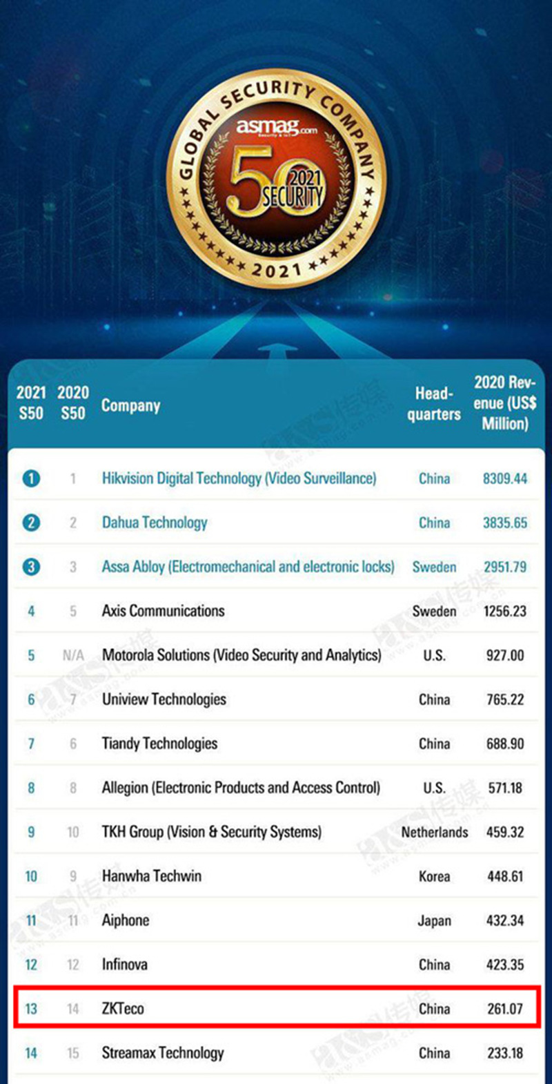 2021全球安防50强榜单出炉,熵基科技位列第13位