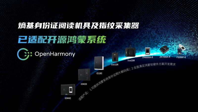 为了协力推动自主创新发展,熵基科技十分重视国内产品的国产适配工作,截至目前,旗下8款身份证阅读机具及指纹采集器完成与开源鸿蒙系统(OpenHarmony)的调试适配,可提供鸿蒙系统身份证解码库,以及全面满足鸿蒙软硬件开发需求。