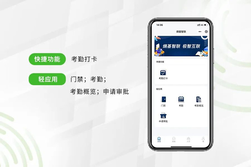 2.设备管理小程序:门禁记录、面部采集、消息通知、考勤打卡、考勤统计。