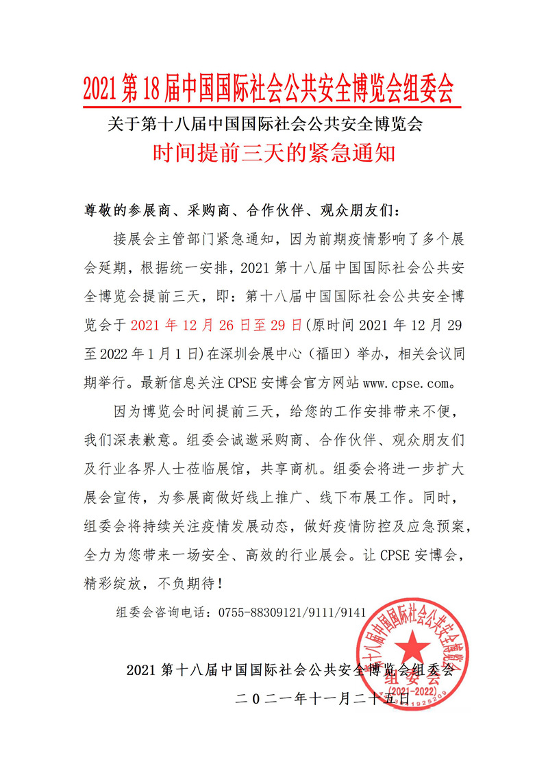 日前,接CPSE安博会组委会通知,2021年第十八届中国国际社会公共安全博览会确定于2021年12月26日至2021年12月29日在深圳会展中心(福田)恢复举办。