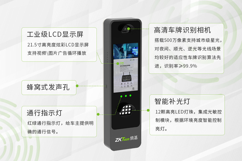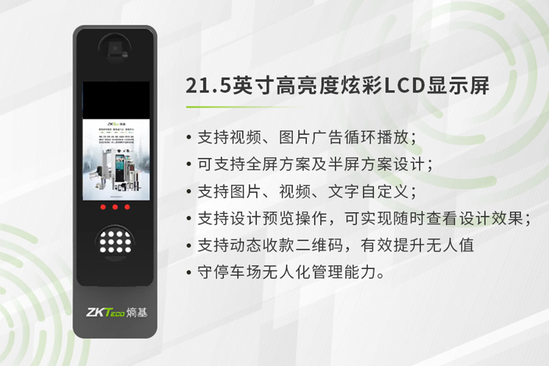 为建设城市智慧交通添砖加瓦,熵基科技结合丰富的行业沉淀与实战经验,面向中高端商业应用场景,推出一款LCD版车牌识别一体机旗舰新星——LPR8800,其集500万高清车牌识别摄像机、21.5英寸高亮度LCD显示屏、智能补光灯等模块于一体,助力停车场智能化改造升级,轻松实现移动支付、无感支付、无牌车动态二维码扫码出入场、LCD屏自定义闲时广告、电子优惠券、电子发票等多元化应用。
