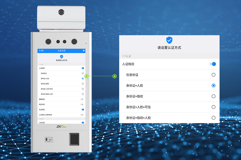 在单一认证模式下,访客仅需根据人脸、身份证、IC卡、指纹等进行识别即可通行;在组合认证中,管理人员可根据使用场景及环境需要,设定不同的组合认证方式,访客需同时满足多个识别内容,才能实现通行。