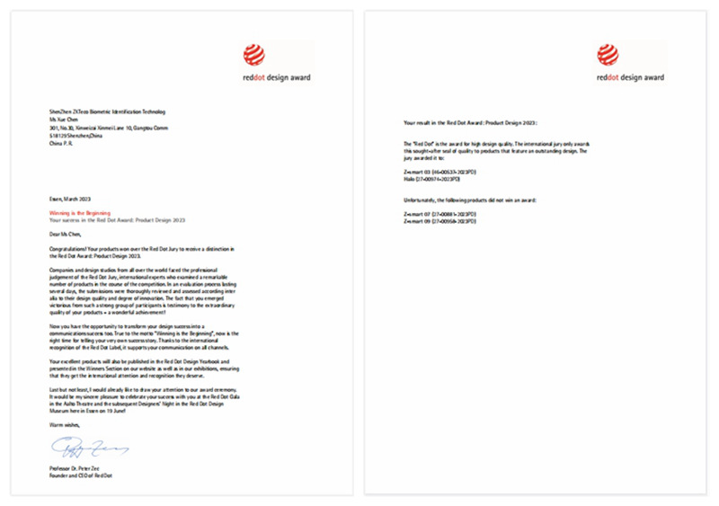 熵基科技两款产品获2023红点奖通知函