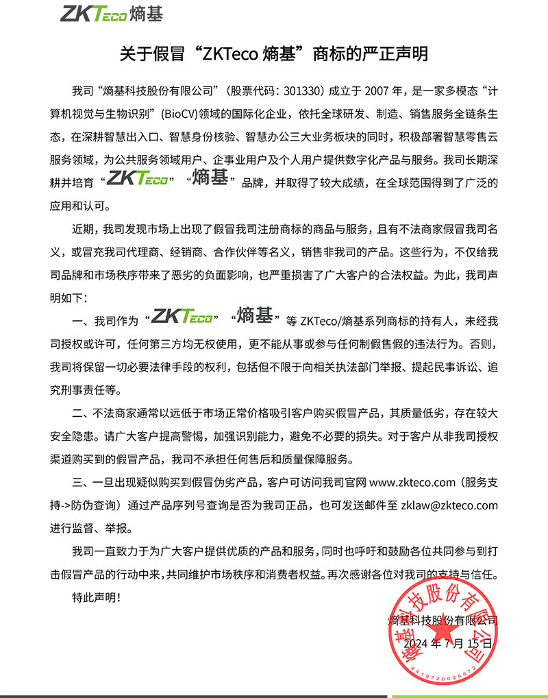 首页> 新闻中心 > 公司新闻 >关于假冒“ZKTeco熵基”商标的严正声明