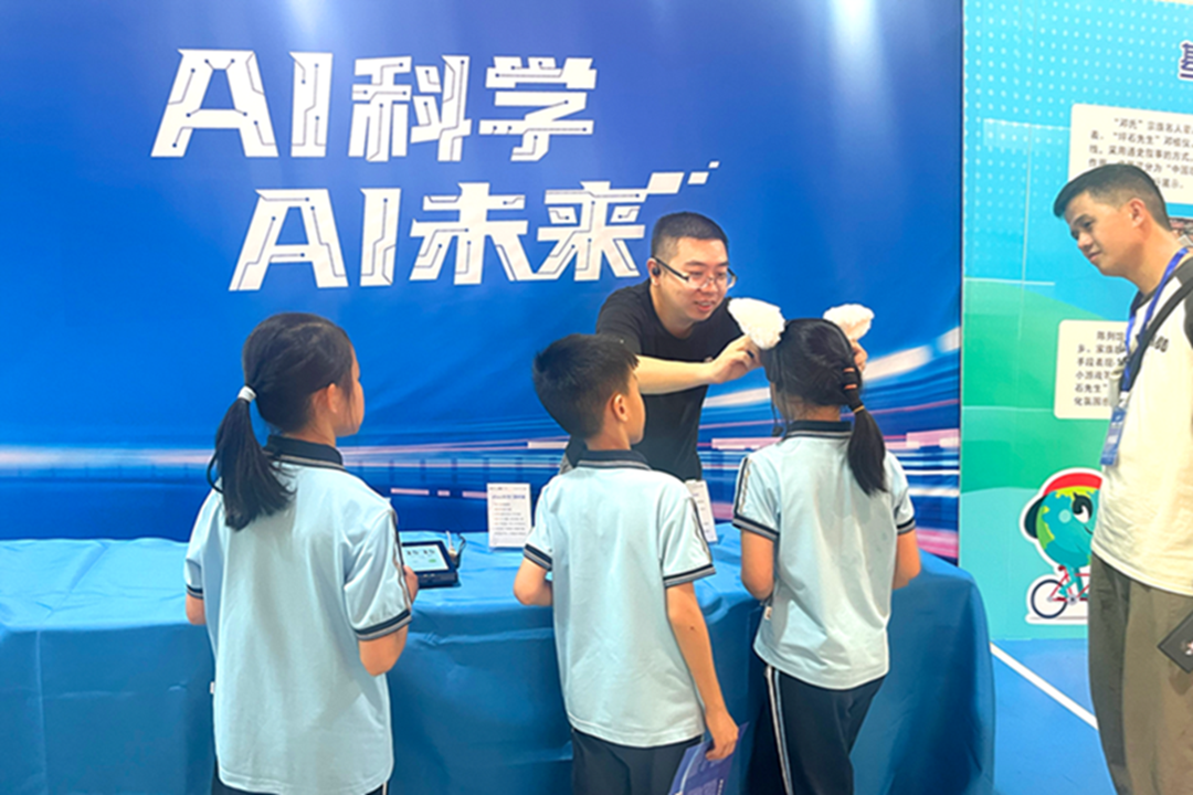 在脑机接口技术板块,智能头箍和脑电头环备受关注,智能头箍凭借可爱的猫耳发箍设计吸引了众多中小学生驻足体验。学生佩戴轻便的脑电采集头环后,只需集中注意力,即可亲身感受大脑信号转化为机器指令的科技魅力。不少学生在体验后兴奋地表示,此次活动让自己真切感受到 AI 技术的趣味性与实用性,进一步激发了对科技探索的兴趣。